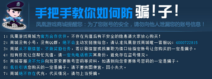 | 3:安全提示: | 本商品需玩家自行充值,请妥善保管好卡密,切勿泄漏给他人。产品一旦售出,非质量问题,不予退换。 |